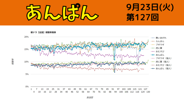 今田美桜主演のNHK連続テレビ小説「あんぱん」。9月23日(火祝)に放送された第127回の世帯視聴率は16.4%。前回比-0.6%。前週同曜日比-0.3%。シーズン平均視聴率は16.03...
